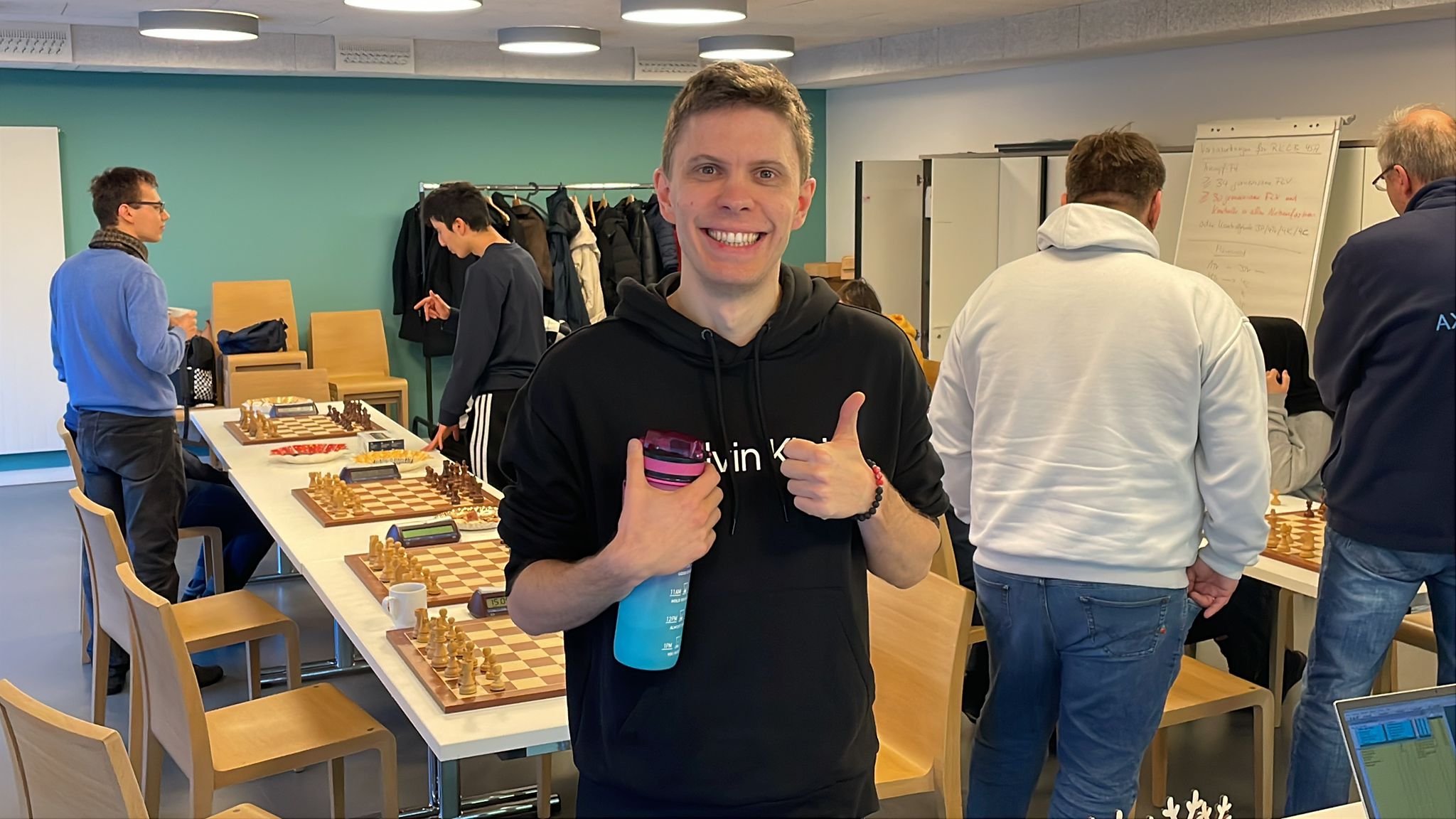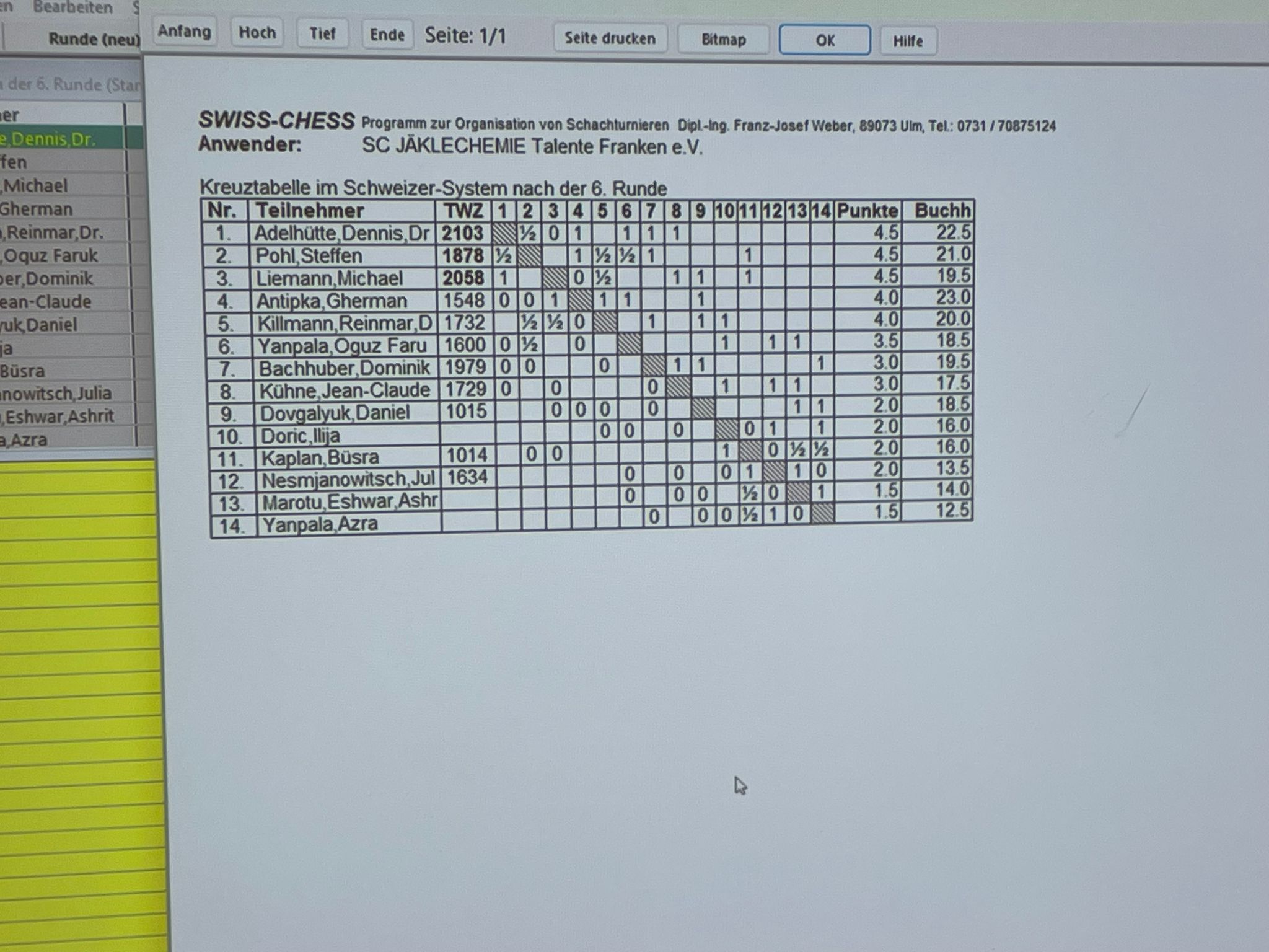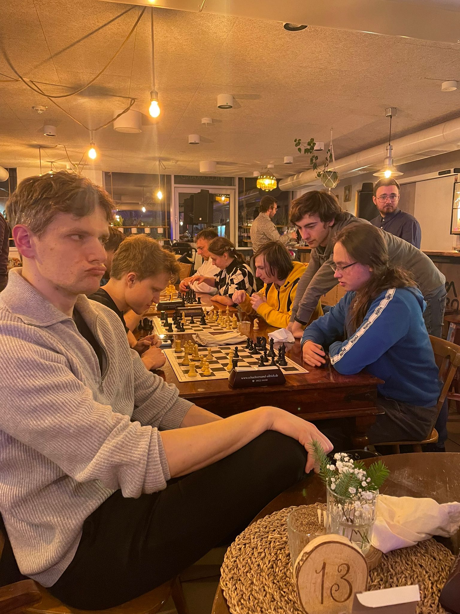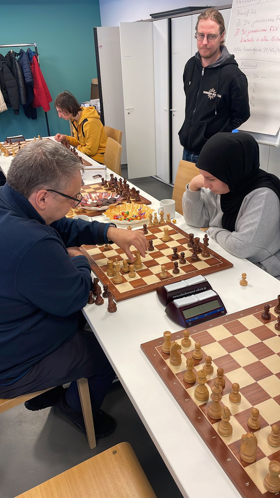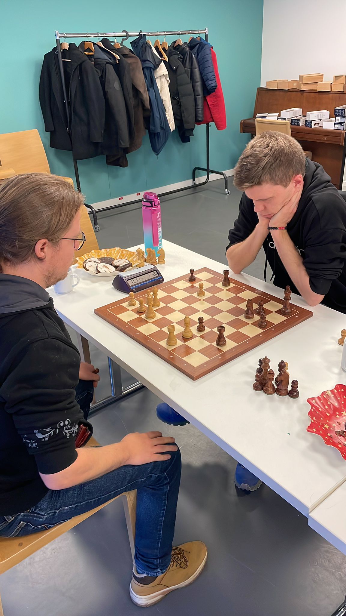 Dennis als mehrfacher Schnellschach-Vereinsmeister war dabei Favorit, gerade die neuen Vereinsmitglieder Steffen Pohl und Michael Liemann hatten in dem sechsründigen Turnier andere Pläne. Mit zunächst 100% musste sich Dennis nach einem Eröffnungspatzer gegen Steffen einigen sehr unangenehmen Drohungen stellen und kam gerade noch so mit einem Remis davon (ausnahmsweise gewann er ein Turmendspiel mit Minusbauer nicht), und von Michael Liemann wurde er in der letzten Runde in einem Jobava-Londoner (1. d4 d5 2.Sc3) schlicht und einfach verprügelt. Damit hätte es Steffen gegen Oguz Faruk Yanpala mit einem Sieg in der Hand gehabt, sich die Krone aufzusetzen; mit Mehrbauer versagten ihm in der Eröffnung aber die Nerven und er kam nicht über ein Remis hinaus. Damit verteidigte Dennis seinen Titel!